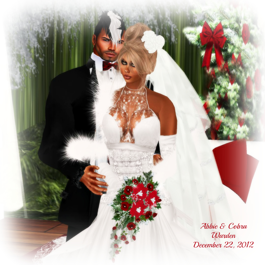 My best friend and one of my Second Life sisters, Abbie, got married in December. As her maid of honour, I was involved from the beginning in helping to pick out dresses, flowers, the cake, tuxes, final decision on the venue and generally keeping the bride from totally freaking out and setting fire to the dresses, flowers, cake, tuxes and venue! (Yes, there’s a story there, perhaps to be told another day 😉 ) The wedding took place on December 22, 2012, but that was actually the third date, due to real life issues. Yes, those play a major part in any virtual wedding, from time zones to health or personal issues to internet and hardware failure (and I don’t mean the wedding night!)