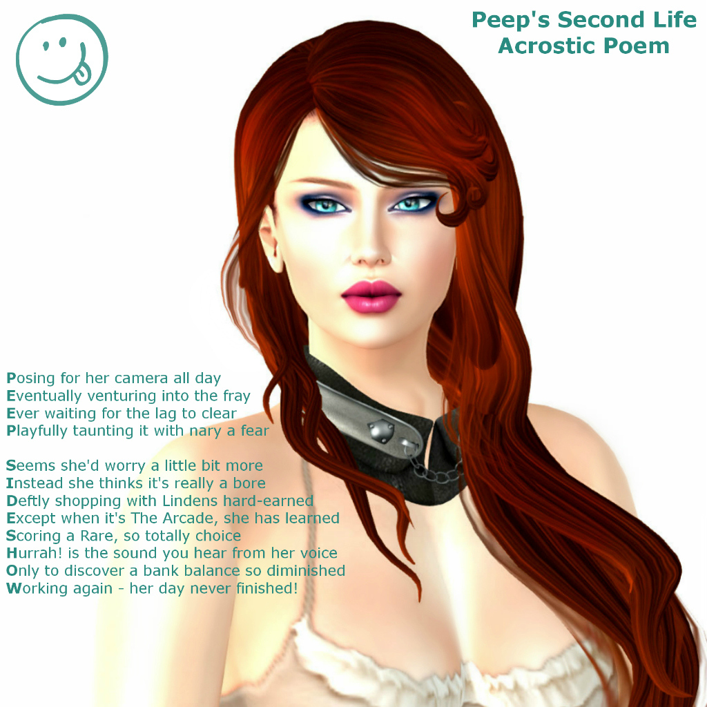 Well, Miss Berry has been taunting those of us taking part in her SL Memes that this week we were really going to hate her! Actually, I found this one to be a lot of fun. Our challenge this week is to write an acrostic poem using our name or anything else that describes our Second Life. Here are the official instructions: