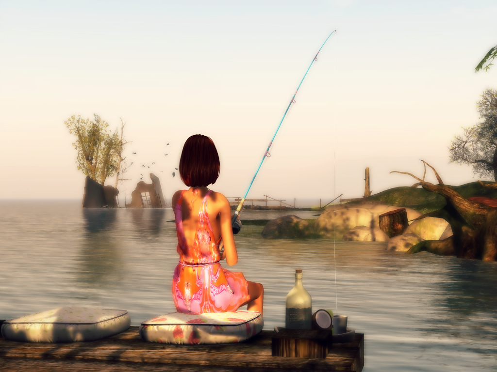 I guess fishing isn’t a bad way to kill some time. I can’t twist my ankle while sitting on this dock. I just have to make sure I don’t get my shoes wet…these Gos pumps cost me a fortune! Yeah, I know I got two colours with the hud, but still!