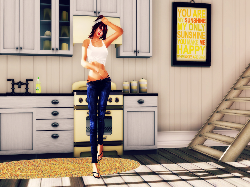 Both outfits are from .:Vivid:. with texture-change huds for the top, belt & skirt of the dress and top and jeans, as well. Thankfully, being able to simply change the colours keeps these outfits out of the laundry!