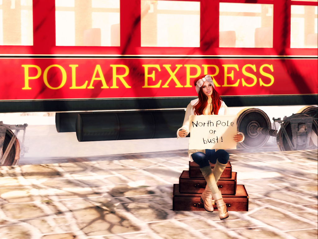 As you would expect, this is a family-friendly sim and there were a lot of people there, skating on the ice rink, exploring the bounteous Christmas and winter scenes and posing for photos. There was a family close to the train doing just that when I attached my pose props and plopped down (the suitcases hold the pose and the sign is separate; there is no reason you couldn’t make a different sign to hold with this pose, unless you are as hopeless at building as I am). I was immediately met with cries of, “Oh, look at Peep! Isn’t she cuteeeeeeee?” And while I tried to ignore them as I blushed and adjusted my camera angle and lighting, I couldn’t help but get caught up in their infectious delight. In fact, I ended up posing for photos for one of the girls 🙂