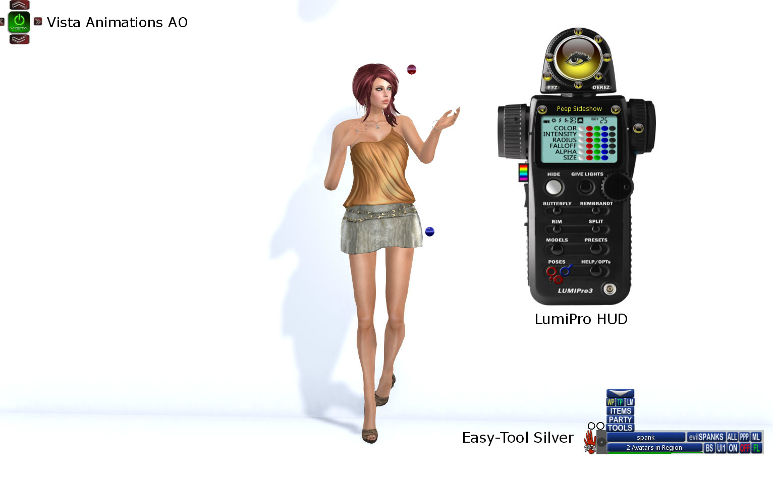 3. Easy-Tool Silver (bottom right) by CJoke Oh: This is the “multi-tool” that I have used for about four years. It has radar, anti-move, spanks, teleport history and storage, and it can rez a whole lot of stuff, like a build platform, a photo changer, a photo studio, a “Spank Butler” in the form of Phillip Linden (LOL) and even, apparently, a sex bed o.O I say apparently because I saw it in the list when I was checking out what all it did, but I didn’t rez it…really! To be honest, I really only use it for the radar, although I have used it a couple of times to rez a build platform.
