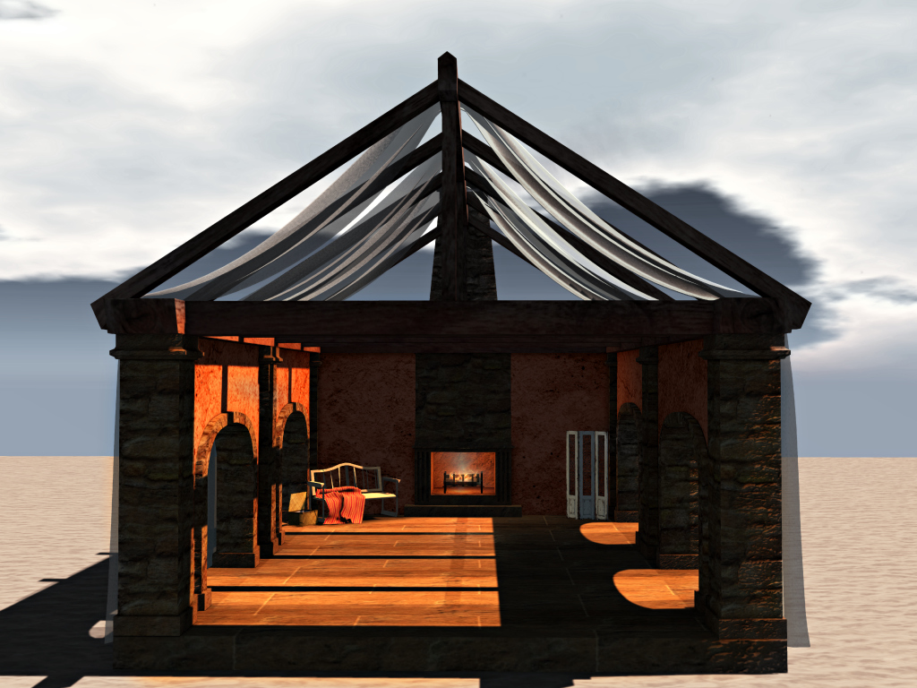 My favourite this time around has to be the Tuscan Patio by [hate this:home]. The warm colours are the perfect background for the detailed textures and the crackling fire. There are versions with and without the drapes, but I love the mystery they give this cozy build.