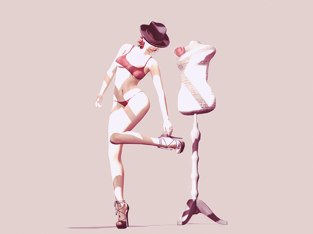 When Johnfrancis Laville passed me over this sexy Homberg, he said he wasn’t sure if it would work for a woman. Pffft, I say! What’s sexier than grabbing your man’s hat and slipping it on with a pair of Come Get Me pumps from Essenz and this tiny fishnet top and (broken) panties by Apple May Designs? Especially when you’re comparing yourself to a static model, even if she is dressed only in a rosebud? It’s all about standing next to some(one)thing that doesn’t look as good as you 😉