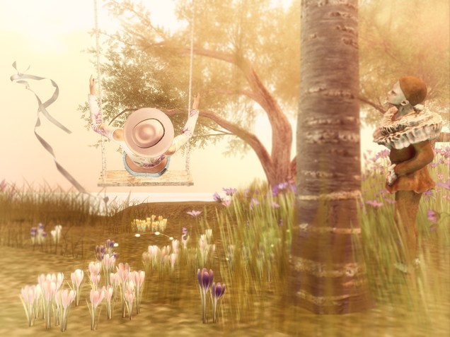 I really want to get this post in before The Liaison Collaborative and Lost & Found close in just a few days. The *Easy Breezy* swing with pose that I am featuring from Le Poppycock will be at TLC until March 30 and the lovely crocuses from [ keke ] will be at Lost & Found until April 1. They are both beautiful and will definitely make you feel like springtime has arrived. You can also get a peek of the newest release from JfL Hats, the Musician Fedora, this time in light colours. While JfL is mainly a men’s hat store, I feature them frequently and I am just thrilled to see that John has released lighter shades for this hat. There are even two shades of pink in the collection! You can just see the top of the bright pink version in this photo, but I will be giving you a better view of the hat later in the week.