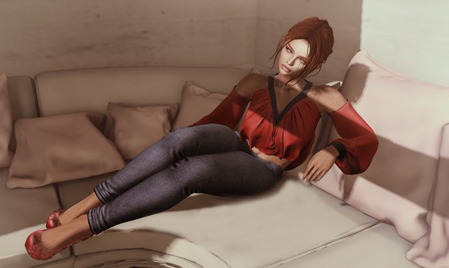 In case you have a bit more energy than I do, you’ll want to head to Uber for the Kaylah Jeans from Just BECAUSE. They come with four versions: long with both tight and loose fits and for boots, also with tight and loose fits. The loose fit styles work with many bodysuits or tucked shirts. But still, try a demo to make sure they work with your selection. The boot style works perfectly with the Anna Boots from Just BECAUSE (available at the main store or on Marketplace, but they may work with other knee-high boots.