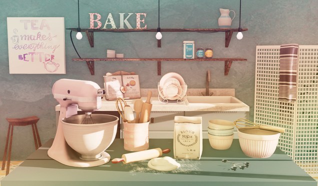 I was so excited to see the latest release from {what next} for Collabor88. The “Patisserie” Kitchen Decor set is a baker’s delight. As usual, each item comes with texture-change options and unbelievably, each one weighs in at only one Land Impact each. I remember the days when a single table setting gobbled up 20 or more prims. With this set you can get your bake on with the full set for a grand total of only five LI!