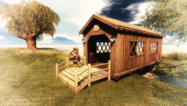 The height of romance is a walk in the country, capped off by a kiss on a wooden bridge. The Old Kissing Bridge is the latest main store release from {what next}. It comes with three texture choices, plus lanterns and steps for decoration. There is even a sign that has three choices of text, plus a plain version in case you want to add your own. The bridge rests on stone piers that can be sunk into the ground or left exposed. On my land, it worked best to sink them, so they aren’t visible, but the texturing is lovely.