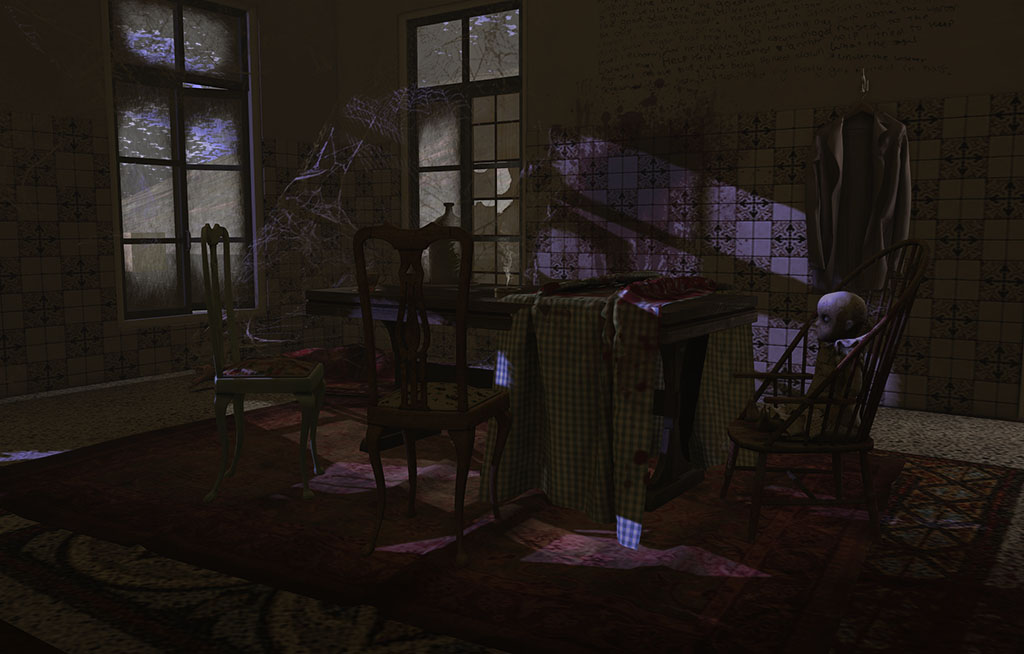 Not only am I the kind of person that watches horror movies with squinted eyes between barely-splayed fingers of one hand while gripping the thigh of my companion with claw-like talons of the other, I was suffering from that Second Life phenomenon known as texture refresh. Yes, the textures on the baby, blood and table cloth kept refreshing, making the fabric and skin appear to crawl like thousands of maggots were just beneath the surface, struggling to get out. And come at me.