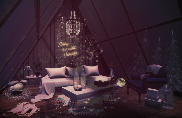 When I logged into Second Life today, I started putting together a room for my post. It was non-seasonal when I began, but somehow, the Christmas Spirit seemed to call my name. That led me to Tannenbaum 2017 and a little festivity began to creep into my setting. I decided that these new holiday things would compliment items already in my inventory from [ keke ], Kuro and {what next}.