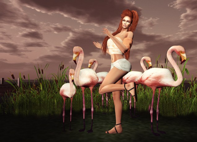 Just having a bit of fun with this cute pose set from Fashiowl at The Liaison Collaborative. I tried to emulate the colours of the flamingos, with my top from [Aleutia] (also at TLC), shorts from JustBECAUSE at FaMESHed and sandals from fri.day at Collabor88. Sometimes it’s nice to just do a photo that makes me smile 🙂