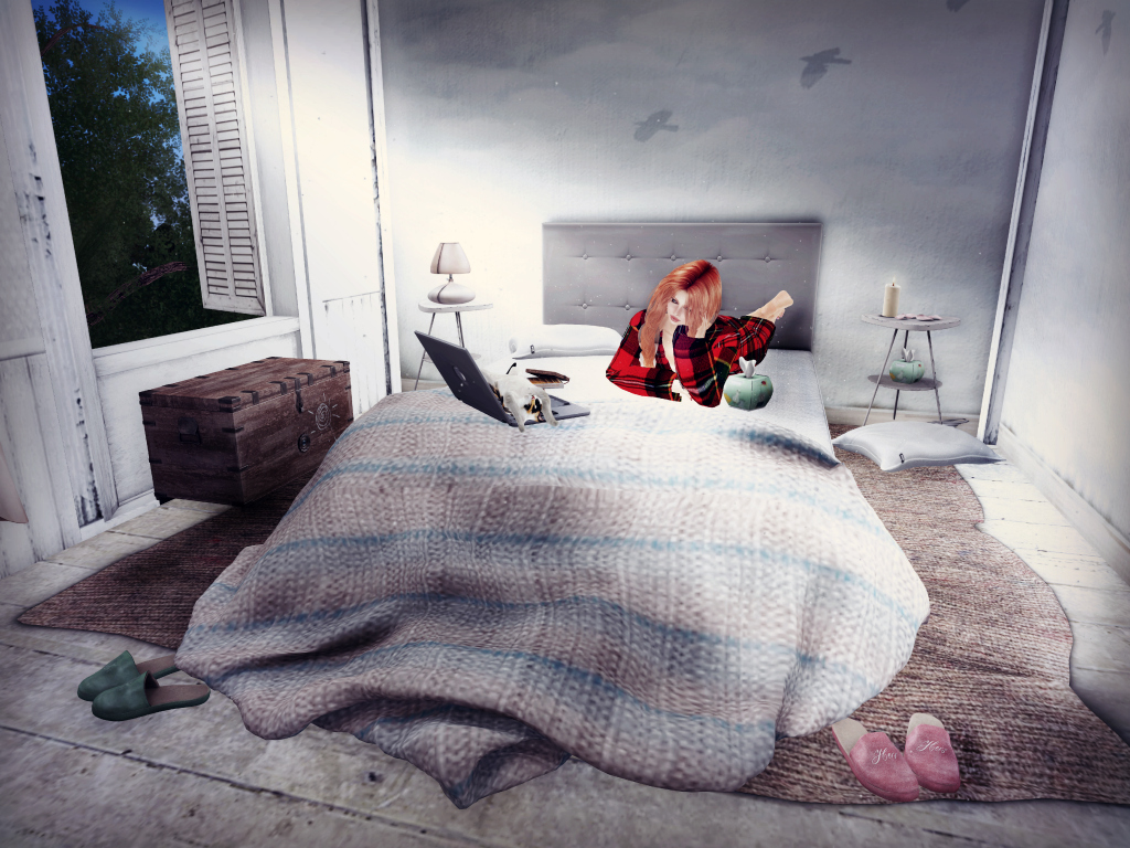Thankfully, Kuro & Consignment have combined to create these marvelous bedroom accessories for The Candy Fair so I can at least recover in style. The bed, side tables, trunk and lamp can all be purchased directly, while the tissues, chocolates, slippers (both pairs) and laptop are part of their gacha offering. I admit that the detail of all of these items perked me up – from the beautifully embroidered “His” and “Hers” on the slippers, to the blankets that you can arrange from neatly made to various levels of messiness to the fact you can watch movies on the laptop (which is naturally made of warm, as the cat will attest). I actually believe that the tissues are the aloe vera type and not the cheap, wood-chips-against-your-nose variety.