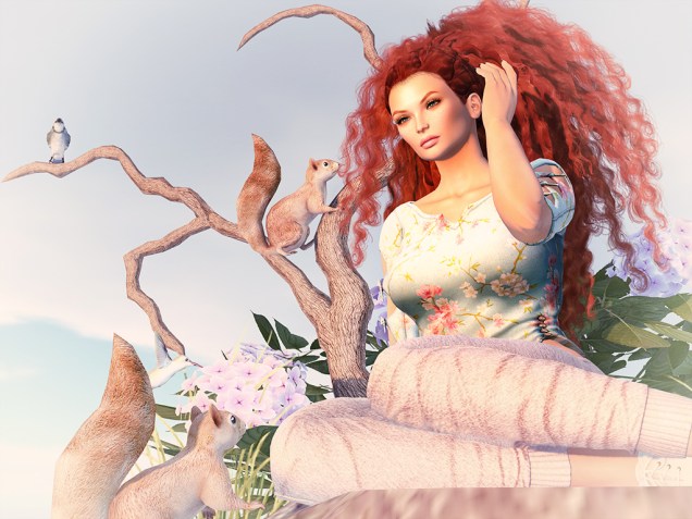 Spring brings the perfect opportunity to settle down for a chat with friends. In this case, they are four-legged and winged pals, courtesy of this cute pose prop from Luane’s World for The Liaison Collaborative. I have no doubt these squirrels are tempted by the flowers on this lovely top from *Just BECAUSE*, an AnnieRose Collaboration available at the main store. This pattern is part of the fat pack, but standard colours come with both a solid and striped version and the detail is incredible. Just check out those buttons on the ruching at the waist and the perfect bows on the tied sleeves. For those who don’t know about AnnieRose, these designs are the product of Annie Melson’s partnership with her daughter, Rose. This top is definitely worth the visit to the mainstore.