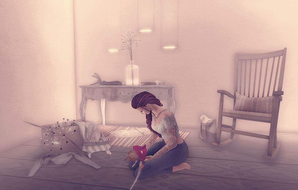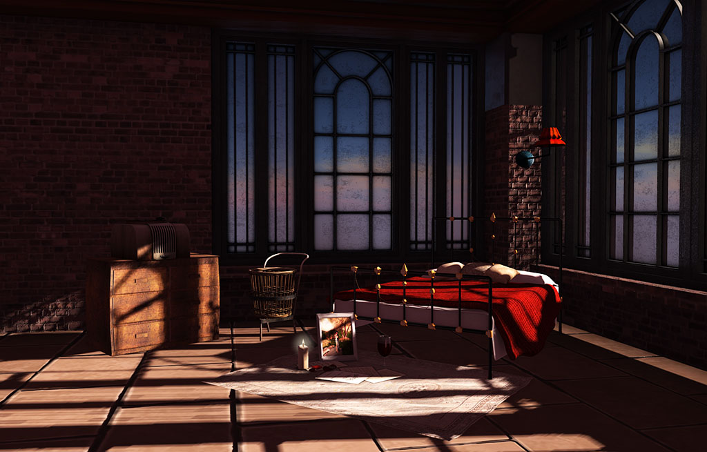 Sometimes when I have something I need to blog, I just start rezzing stuff and see what turns out. In this case, I started with the Cozy Bed from Kuro in the Iona Conservatory from Trompe Loeil. The reason I started with this build is because I had it rezzed on my platform and couldn’t be bothered to get rid of it and start with something new. Besides, I love the shadows it creates, so win-win.
