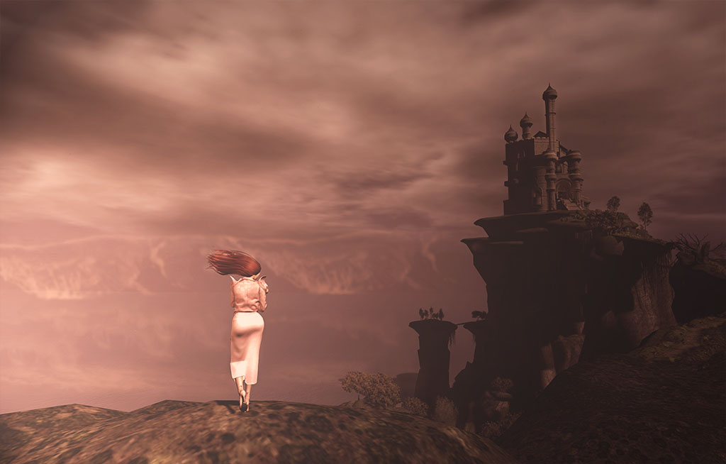I wanted to find a location that lent itself to a windy feeling to highlight the hair from Tableau Vivant at The Arcade, and Skye Elgol, one of Alex Bader's Studio Skye showcase sims, was perfect. It is actually his castle and keep showcase sim, so the vista is at once foreboding and mystical. I added the crashing waves in Photoshop; I just thought it helped give a sense of a windy, desolate landscape.
