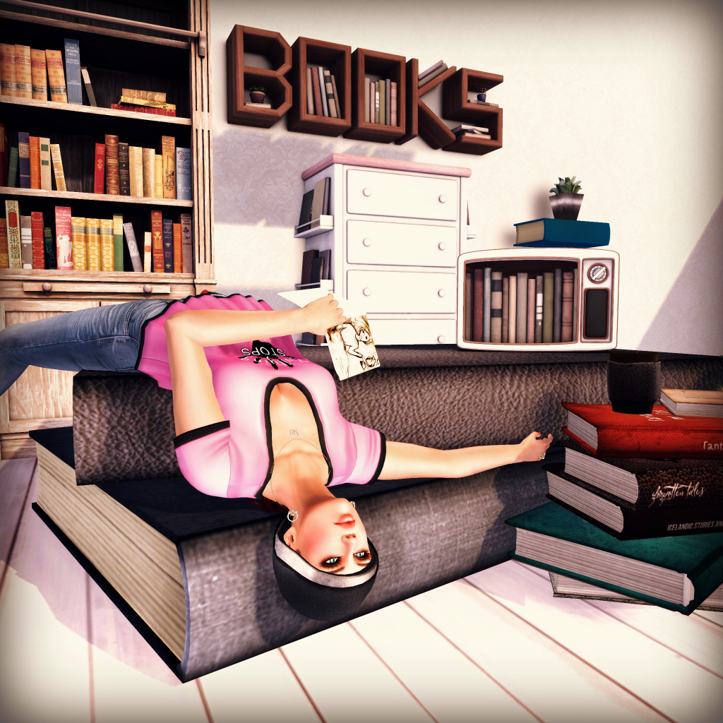 Doing the pictures for this blog, I realised my love of reading carries over to my Second Life. I was spoiled for choice of items to use in these photos. Bookcases, stacks of books, magazines, single books, pose props, furniture…you name it, I had it! It is days like this that I love having an embarrassingly large inventory 😉